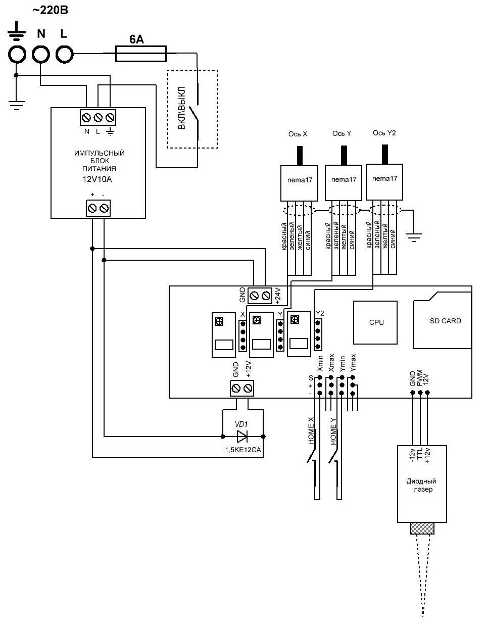 Контроллер имеет 2+1(вторая ось Y2 для случая использования двух шаговых двигателей на оси Y) оси с функцией look ahead(просмотр кадров вперед для построения движения по кривой с постоянной скоростью) . В контроллере имеется возможность подключать лазерные модули с PWM входом и программно управлять мощностью лазера. Как и в старом контроллере можно менять скорость перемещения программно по параметру F, а также преимущество нового в том что в процессе работы можно подстраивать в процентном виде текущую заданную скорость, меняя положение ручного энкодера. На флеш карту можно записать неограниченное кол-во файлов, ограниченное только разметкой FAT32. SD Флеш карты можно использовать любые обьемом до 32Гб с разметкой Fat32. В контроллере присутствует поддержка программных ограничений перемещений, для удобной работы в ручном режиме. Программное включение и выключение питания шаговых двигателей(отключение драйверов ШД сигналом enable). Настройка осей поддерживает индивидуальную для каждой из осей настройку парараметров такие, как кол-во шагов на 1мм перемещения, ускорение, максимальная скорость. В контроллере реализован ожидаемый всеми алгоритм обновления через SD карту, обновление микропрограммы контроллера производятся через SD карту с разметкой FAT32, просто копируете файл обновления на карту, вставляете ее в контроллер и подаете питание. Обновления для контроллера можно будет скачивать здесь по мере их появления.